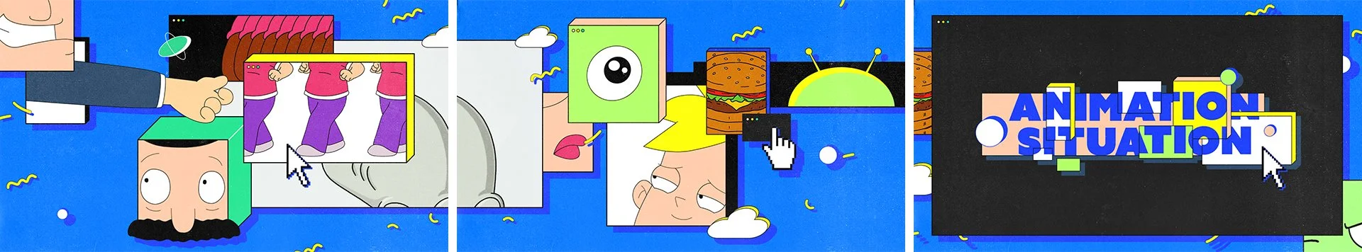 Animation Situation is a collection of TBS’s best running cartoons. In this job, I had much fun bringing all the hero characters from each of these cartoons and making them interact between window screens/boxes, borrowing ideas from the web world.